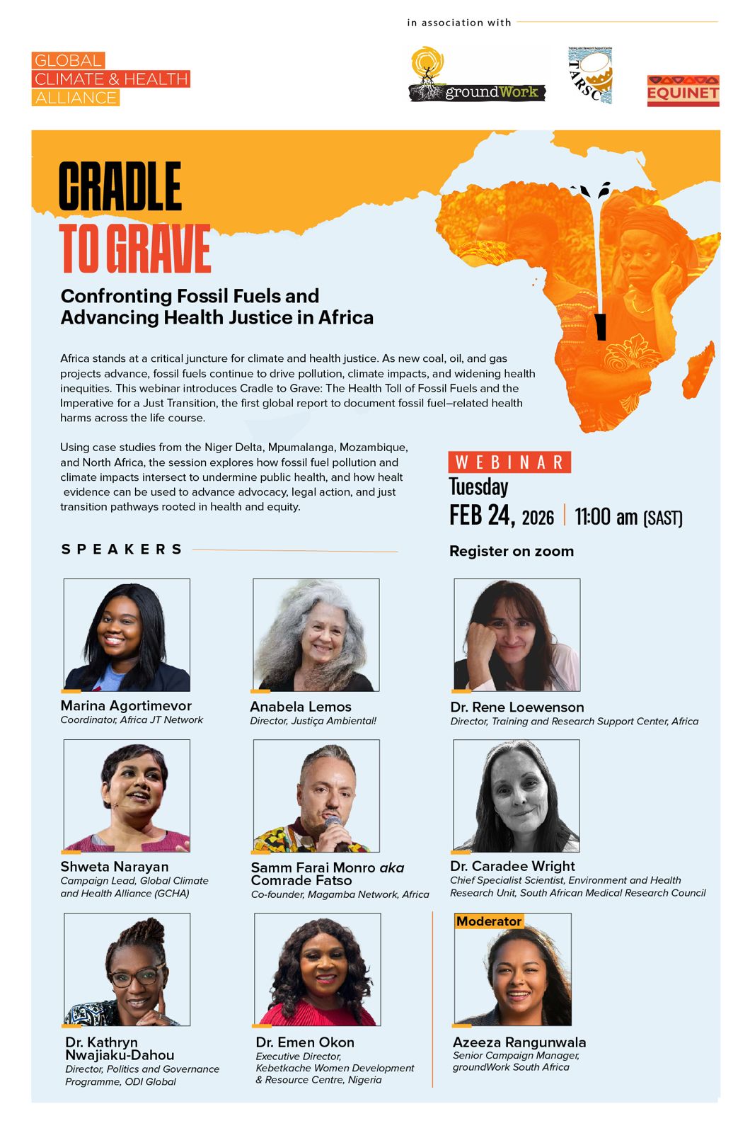 Africa stands at a critical juncture for climate and health justice. As new coal, oil, and gas projects advance, fossil fuels continue to drive pollution, climate impacts, and widening health inequities. This webinar introduces Cradle to Grave: The Health Toll of Fossil Fuels and the Imperative for a Just Transition, the first global report to document fossil fuel–related health harms across the life course. Using case studies from the Niger Delta, Mpumalanga, Mozambique, and North Africa, the session explores how fossil fuel pollution and climate impacts intersect to undermine public health, and how health evidence can be used to advance advocacy, legal action, and just transition pathways rooted in health and equity.